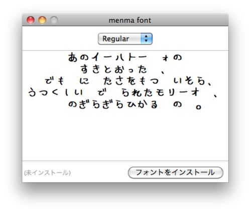 このアニメは的確に面白いことをやるなぁと思う。めんまフォントをダウンロードしてみた。Macでも使えるとのこと。DLしたあと、ZIP解凍して出てきた.ttfをダブルクリック。 インストール。 ほい使えるようになった。お手軽だね。 基本的にひらがなしか使えず…